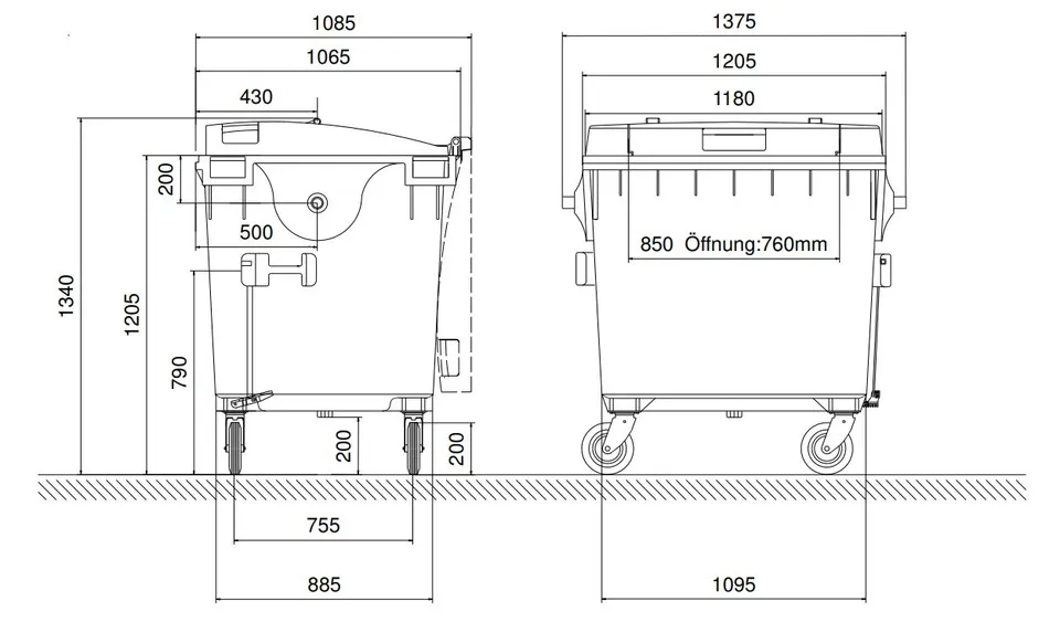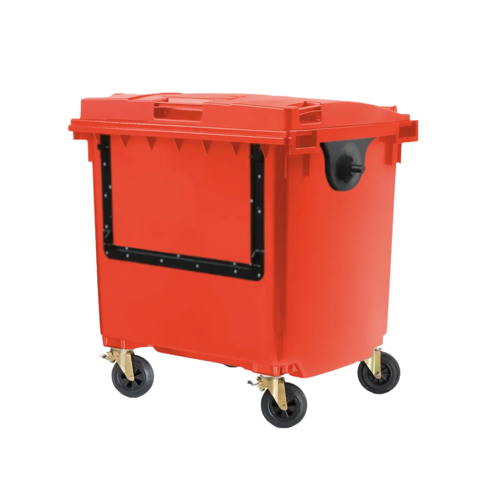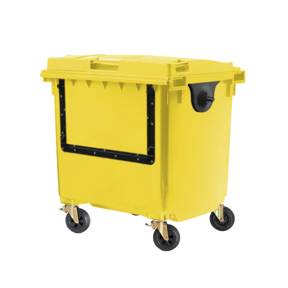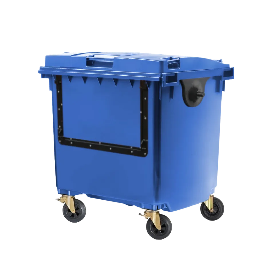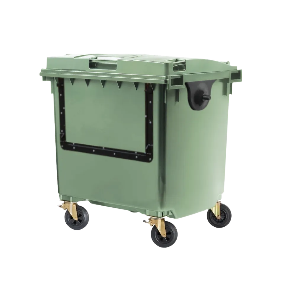 The 1100L Drop-Front Wheelie Bin is built from high-density polyethylene to endure the demands of daily use in challenging environments. Its hinged front panel offers an innovative alternative to standard lidded bins, ideal for areas where space limitations restrict traditional lid operation.